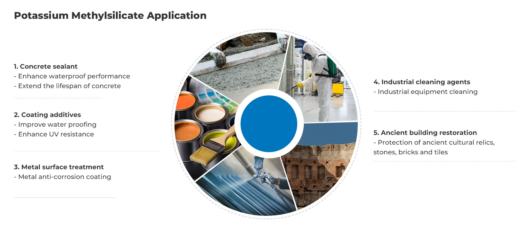 W rzeczywistych zastosowaniach budowlanych wodoodporne działanie metylokrzemianu potasu zostało przetestowane w wielu praktykach inżynieryjnych. Wodoodporna membrana utworzona z metylokrzemianu potasu wytrzymuje długotrwałe zanurzenie w deszczu i ciśnienie wody, skutecznie zapobiegając przedostawaniu się wilgoci do wnętrza konstrukcji budynku, przedłużając w ten sposób żywotność budynku i zmniejszając koszty konserwacji.